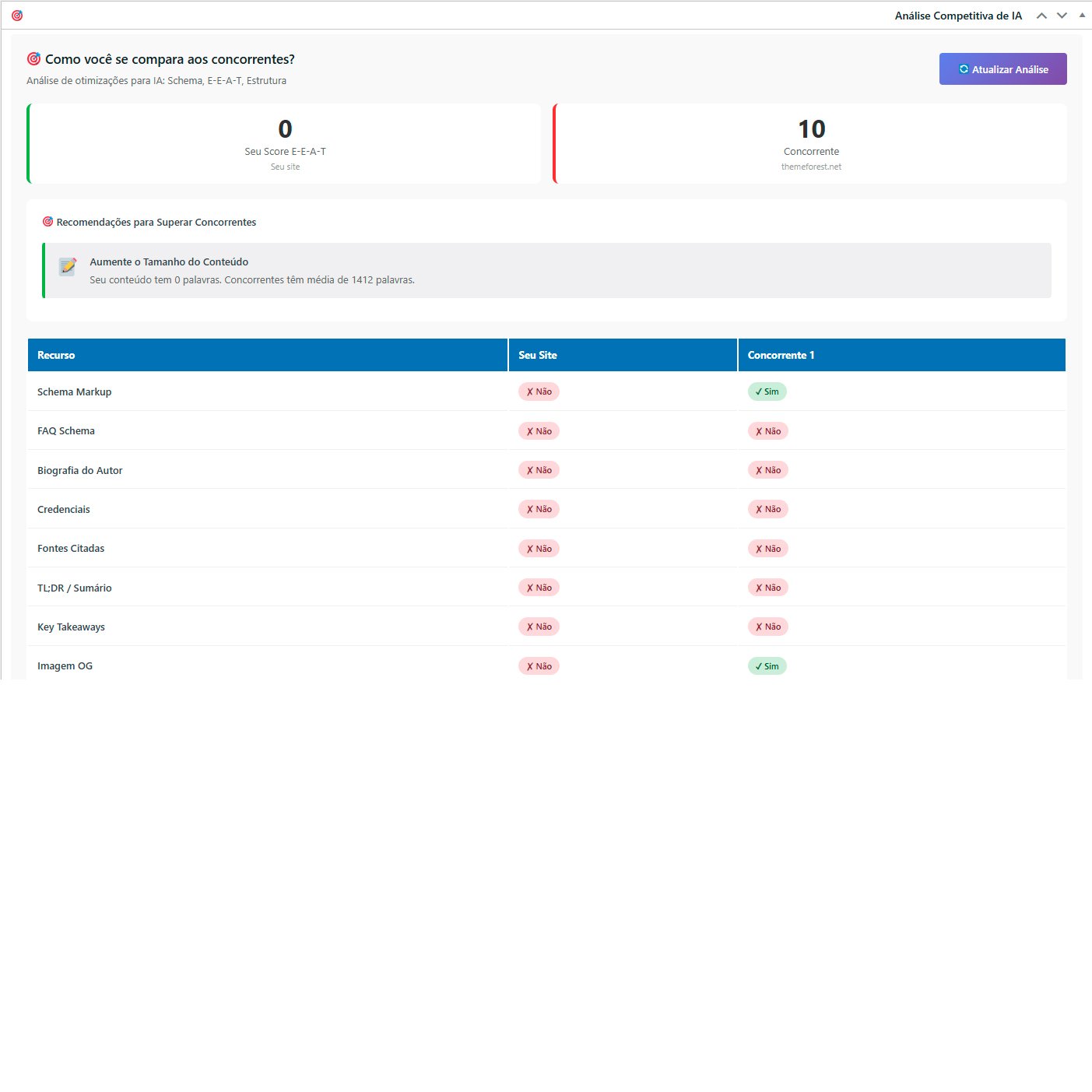 Este add-on complementa o AI-Ready SEO, permitindo análise comparativa automática entre seu site e até 5 concorrentes, focando em otimizações específicas para ranqueamento em mecanismos de busca baseados em IA.
